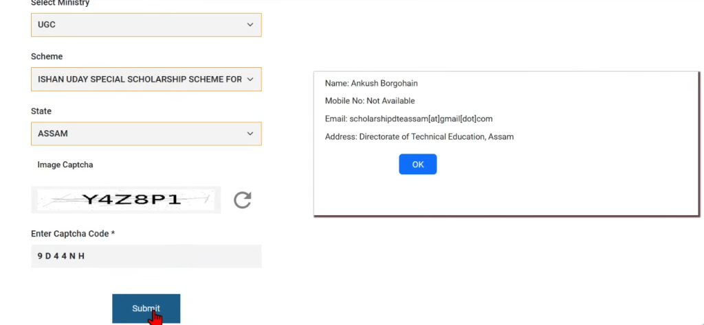 Click on the ‘Apply For Scholarship’ button, and it will ask you to enter your OTR ID and password. Then, enter the image captcha and security pin.