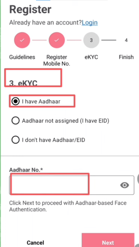 Next, you need to complete E-KYC. You can do this using your Aadhaar card number. Enter your Aadhaar card number and click on the ‘Next’ button.