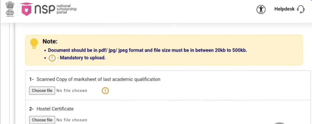 Upload required documents (PDF/JPG, 20KB-500KB). Include marksheets, certificates, income proof, and fee receipts.